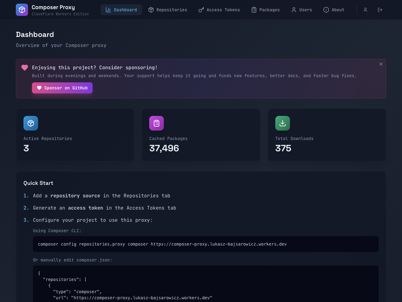 Dashboard showing repositories, cache stats, and recent activity