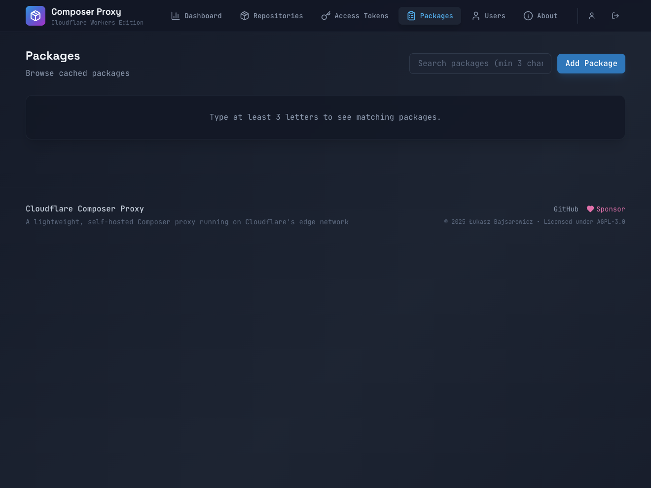 PACKAGE.broker caches packages at the edge (Cloudflare) or in your storage backend (S3, R2, MinIO). On first request, packages are fetched from source and stored. Subsequent requests are served instantly from cache, dramatically reducing install times. Cache invalidation happens automatically via webhooks or manually through the dashboard.