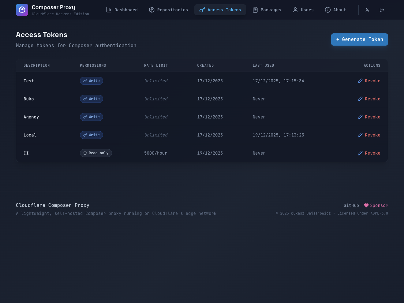 PACKAGE.broker uses secure token-based authentication. Generate tokens in the dashboard, then use them in your composer.json or CI/CD environment variables. Tokens can be scoped to specific repositories and have expiration dates for enhanced security.